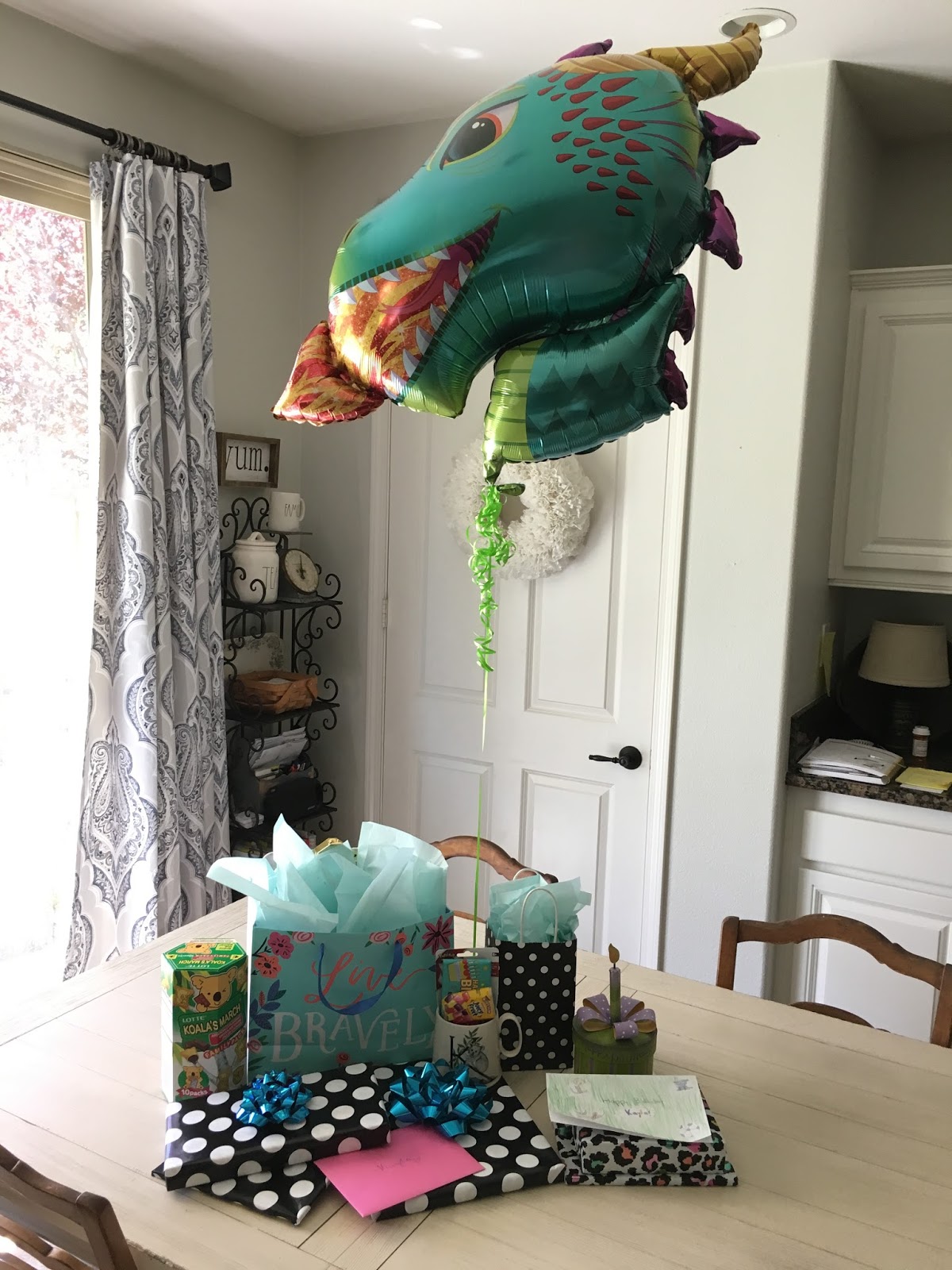 As soon as I dropped her off at school I got busy getting things ready for her. I drove to Party City and picked up a dragon balloon for our dragon loving girl and I set up all of her presents for her so she'd see them as soon as she got home